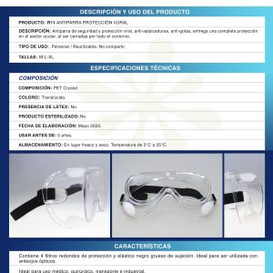 Antiparra de seguridad y protección viral, anti-salpicaduras, anti-gotas, entrega una completa protección en el sector ocular, al ser cerradas por todo el contorno. Viene con ranuras laterales y plástico PET Crystal de alta nitidez, con sistema anti-empañamiento (Anti-Fog). Contiene 4 filtros redondos de protección y elástico negro grueso de sujeción. Ideal para ser utilizada con anteojos ópticos. Ideal para uso médico, quirúrgico, transporte e industrial.