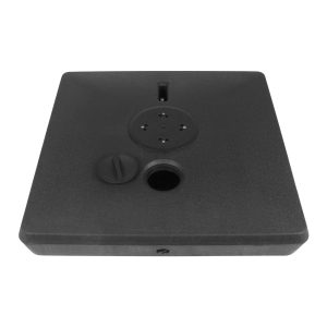Base cuadrada de plástico rígido, rellenable (con agua, arena o piedrecilla, para darle mayor peso), con una capacidad total de 140kg o 140L. Viene con 4 ruedas sobre estructura de Acero y manilla tiradora retráctil, para fácil traslado y movimiento del quitasol.