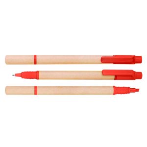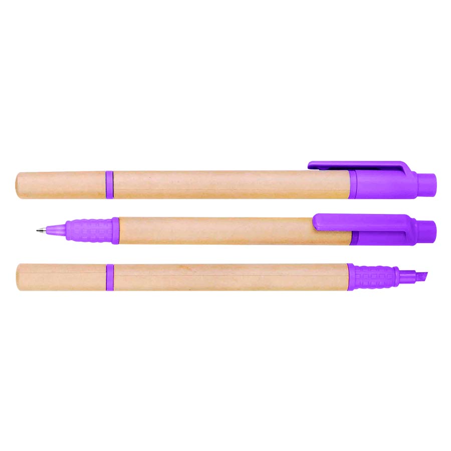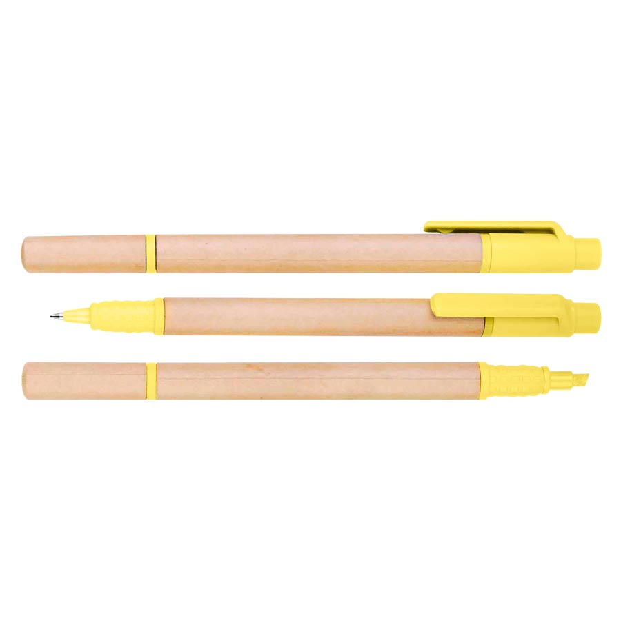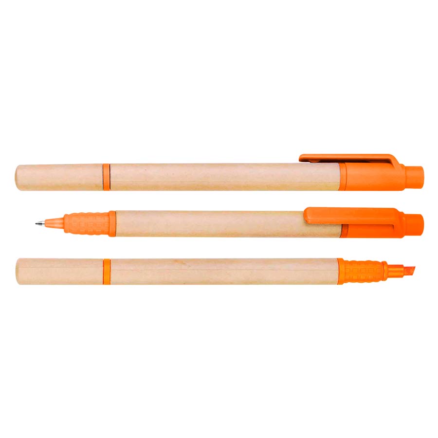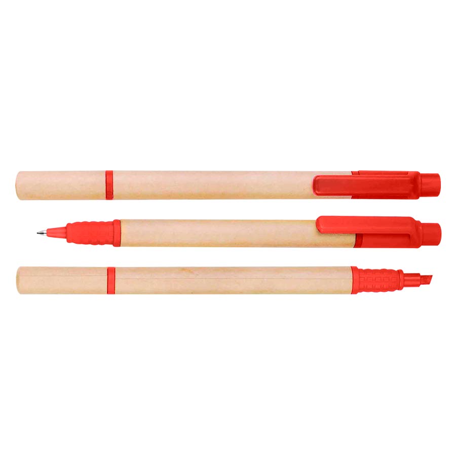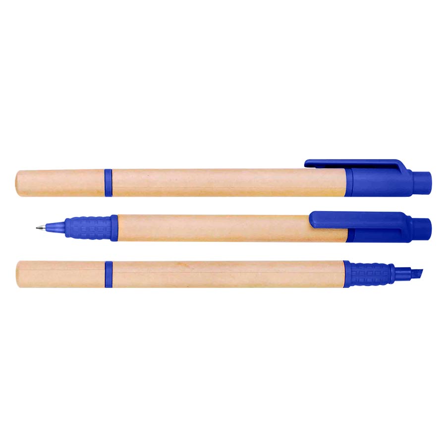 Bolígrafo Ecológico de cartón reciclado con destacador de color. Escritura azul.