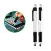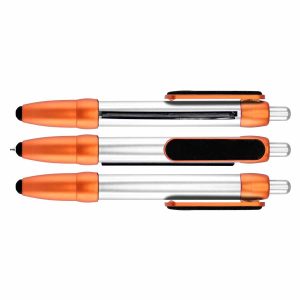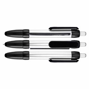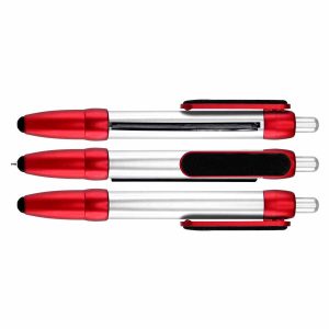 Bolígrafo plástico modelo «Flag», con cuerpo plateado y terminales de color metalizado. Incluye bandera retráctil de tela (para impresión), puntero «Touch-Screen» y clip gamuzado negro para limpiar pantalla táctil. Escritura azul.