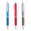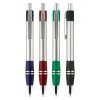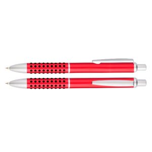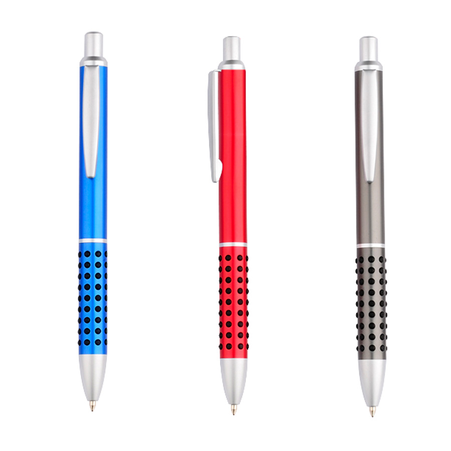 Bolígrafo metálico satinado modelo «Caterpillar», con lunares de goma negra que brindan una suave sensación de masaje dactilar al escribir. Escritura azul.