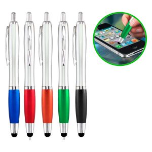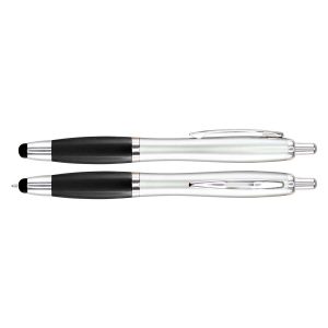 Bolígrafo plateado «New Satin Touch-Screen» con goma negra para pantalla táctil. Escritura azul.