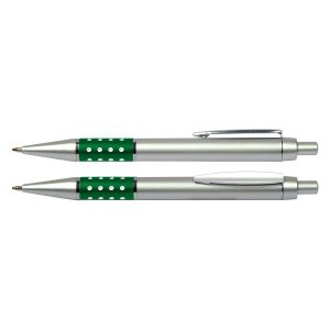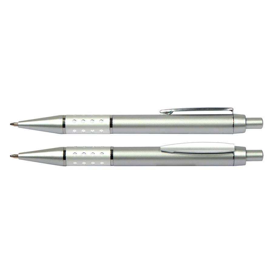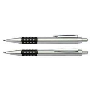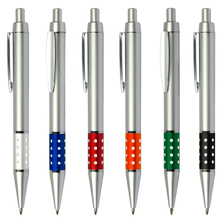 Bolígrafo Plástico Metalizado modelo «Alum», con anillo metálico con orificios. Escritura azul.