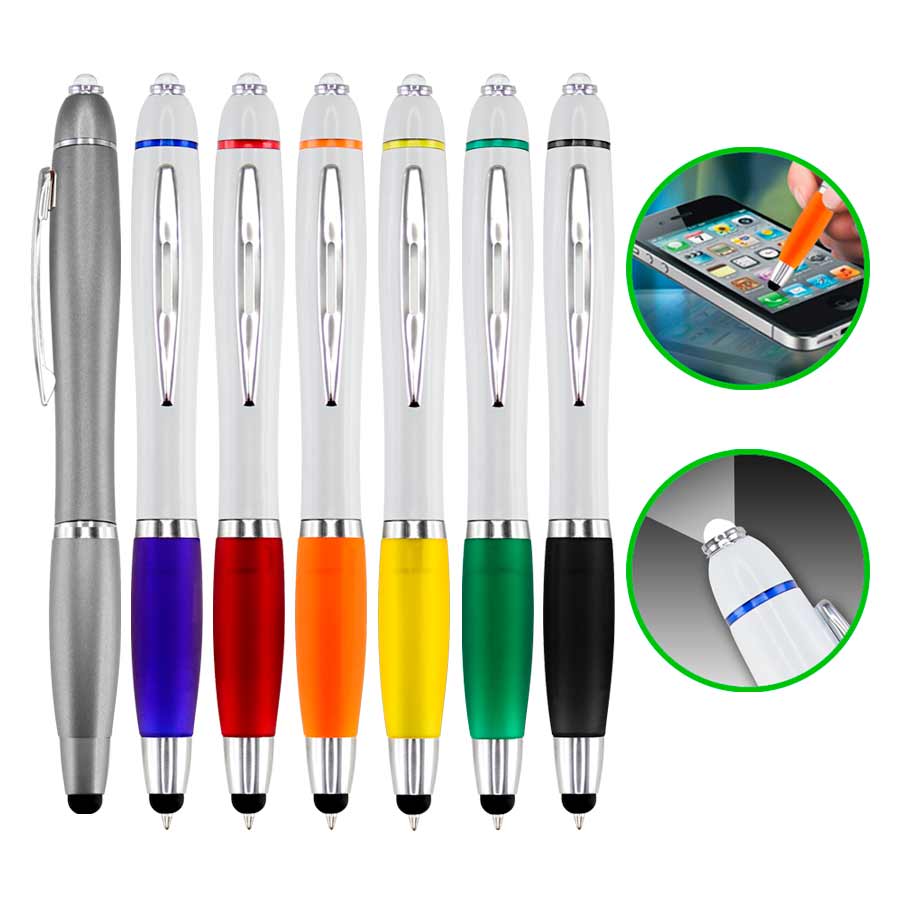 Bolígrafo plástico modelo «Wind Stella LED». Incluye puntero «Touch-Screen» y linterna LED. Escritura Azul.