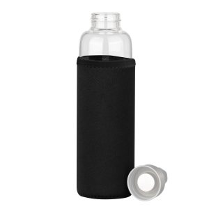 Botella cilíndrica de Borosilicato de alta resistencia. Incluye tapa rosca de Acero inoxidable y cinta lanyard colgante de polipropileno (PP) color plata en su parte superior. Cuenta con una práctica funda removible de tela Neopreno aislante en colores, para una mayor protección contra golpes y temperatura . Producto BPA FREE, para el contacto con todo tipo de líquidos. Capacidad 580ml. Apta para Lavavajillas (sin funda) y para Horno Microondas.