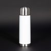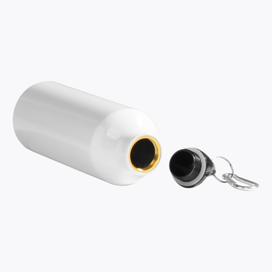 Botella blanca de Aluminio de 800cc. con cobertura para Sublimación. Incluye tapa rosca plástica y mosquetón metálico plateado.