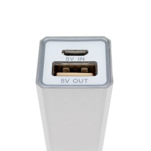 Cargador Power Bank USB portátil metálico rectangular. Capacidad 2200mAh. Entrada 5V/1A, salida 5V/1A. Incluye cable USB/Micro USB. Batería recargable incorporada. Presentación en caja de regalo de cartón negro .