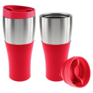 Coffee Mug grande de 500cc plástico «PP-FRESH», tapa rosca y banda de Acero Inoxidable ideal para imprimir logos. Presentación en caja de cartón plateado.