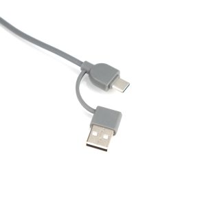 Connect Multicargador 4 en 1, con cuerpo rectangular de madera de bamboo y llavero metálico con mosquetón. incluye 3 cables de plástico circular engomado TPE de color gris, uno de 1m de largo, los otros 2 de 10cm c/u,  con conector USB tipo (Micro-USB / Lightning / Type C) y  conector  de carga (USB / Type C). Presentación en bolsa 100% compostable + caja de regalo en cartón color natural.