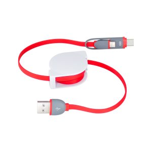Connect Multicargador Retráctil, con cable de 1m de plástico engomado TPE de color, terminales de carga USB y Micro USB / Lightning / Type C. Incorpora nueva tecnología de cable cargador dual Micro USB y i-phone (en el mismo terminal). Compatible con dispositivos Android, Apple y Type C. Soporte plástico ABS blanco con amplia área de impresión. Presentación en elegante bolsa OPP con orificio para ganchera. Producto con aprobación CE, ROHS, FC.