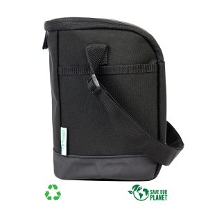 Bolso cooler modelo «Planet» de 7.5 litros de capacidad, fabricado en tela RPET, en base a pellets de botellas plásticas recicladas y poliéster 250D/PVC. Interior térmico aislante de PEVA y acolchado con esponja PE FOAM.