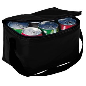 Cooler para 6 latas de bebidas o cervezas, también utilizable como lonchera. Tela exterior 420D/PVC Poliéster. Tela interior PVC metalizado aislante.