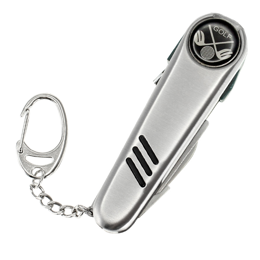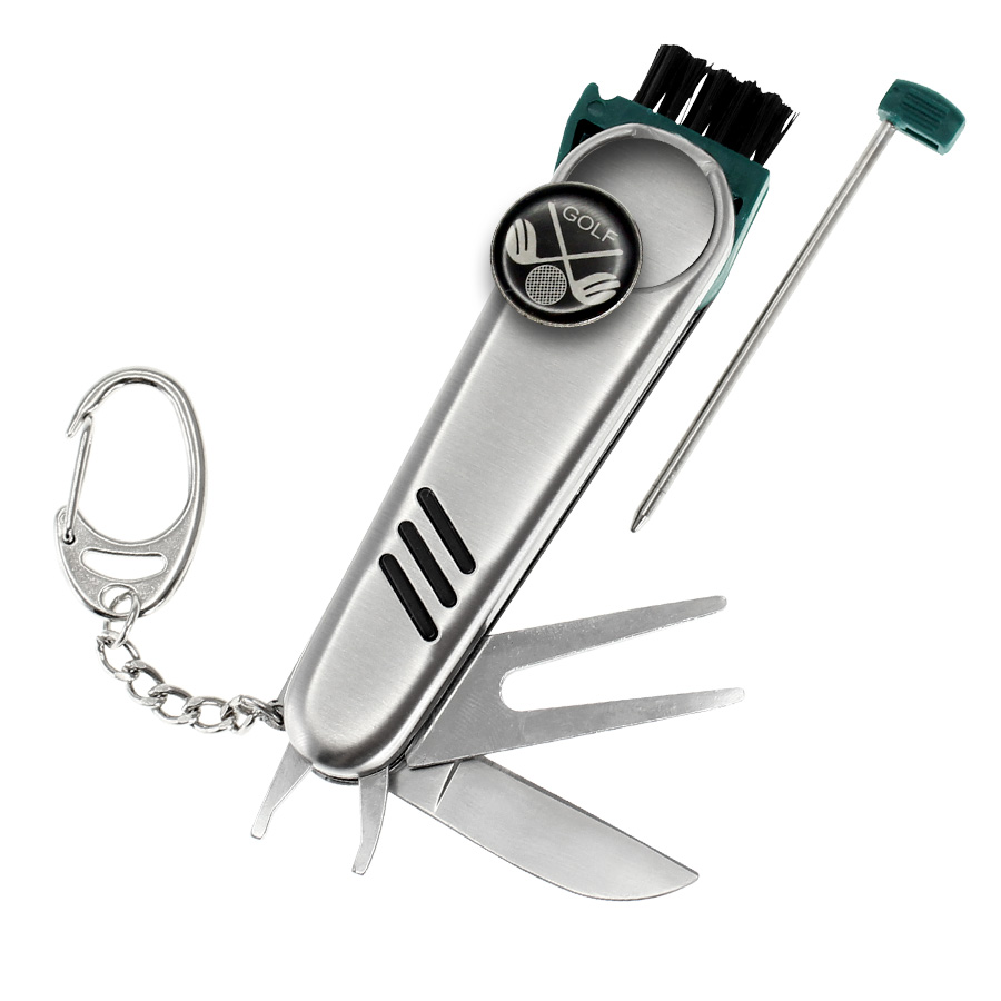 Cortaplumas de Golf de Acero Inoxidable con 7 funciones. Incluye Cuchillo, Levanta-Pique corto, Levanta-Pique largo, Cepillo, Bolígrafo tinta negra, Marcador magnético y llavero. Presentación en caja de regalo plateada.