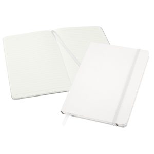 Cuaderno modelo «Colorskine» tamaño A5, con cubierta de cartón piedra forrada en PU simil cuero de color de 1.5mm de espesor. Interior 80 hojas lineadas amarillas de 80gsm. Incluye banda elástica y huincha separador de hojas al tono. Presentación individual en bolsa de polipropileno.