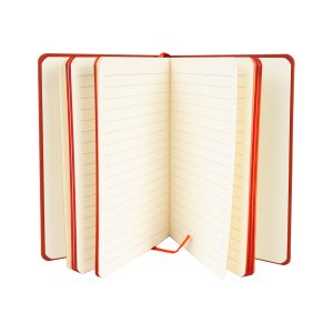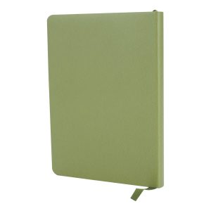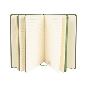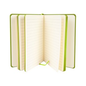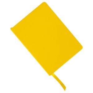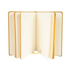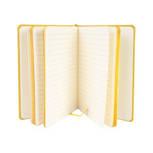 Cuaderno tamaño A5, con cubierta de PU eco-cuero de 2mm de espesor y lomo pintado de color al tono. Interior 80 hojas lineadas amarillas de 80gsm. Incluye banda separador de hojas al tono. Presentación individual en bolsa de polipropileno.