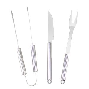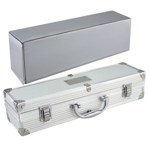 Deluxe BBQ set de asado en caja metálica. Incluye 3 herramientas de asado 100% acero inoxidable: cuchillo, tenedor y tenazas. Interior recubierto en tela ecológica negra. Manilla y cierres metálicos. Incluye placa metálica rectangular para grabar logo. Presentación bubble-bag + elegante caja de cartón laminado plateado.