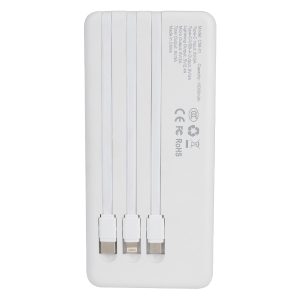 Deluxe cargador Power-Bank USB con pantalla indicador de carga. Capacidad 10000mAh. Amplio espacio para logo. Input: DC 5V 3A / Output: DC 5V 3A. Viene con 3 cables incorporados: micro USB, Tipo C, i-phone. Incluye cable de carga USB / Tipo C. Incluye manual de uso en español e inglés. Presentación en Estuche de cartón forrado color blanco. Producto con Certificaciones.