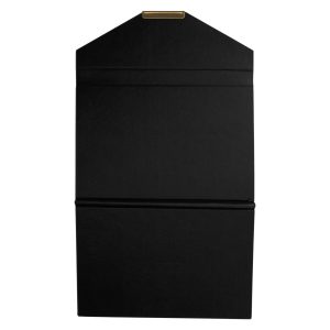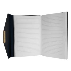 Deluxe Cuaderno tamaño A5 modelo «ENVELOPE», con tapas duras de cartón forrado en PU eco-cuero, con 80 hojas lineadas blancas. Contiene cierre metálico imantado color dorado.