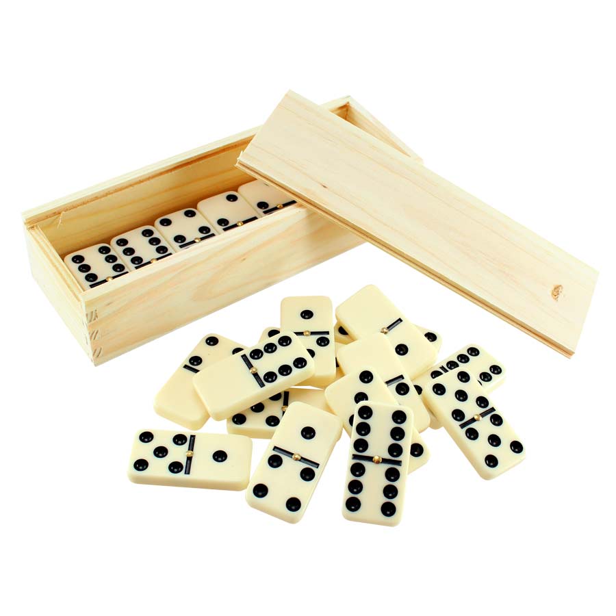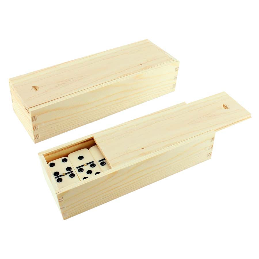 Set de Dominó clásico en estuche de madera con tapa corrediza. Presentación en caja de cartón.