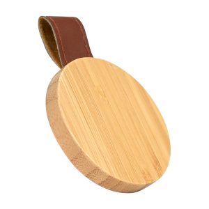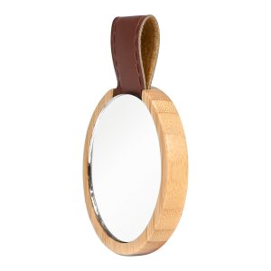 Espejo redondo con cuerpo de madera de Bamboo y correa de Eco-Cuero café.