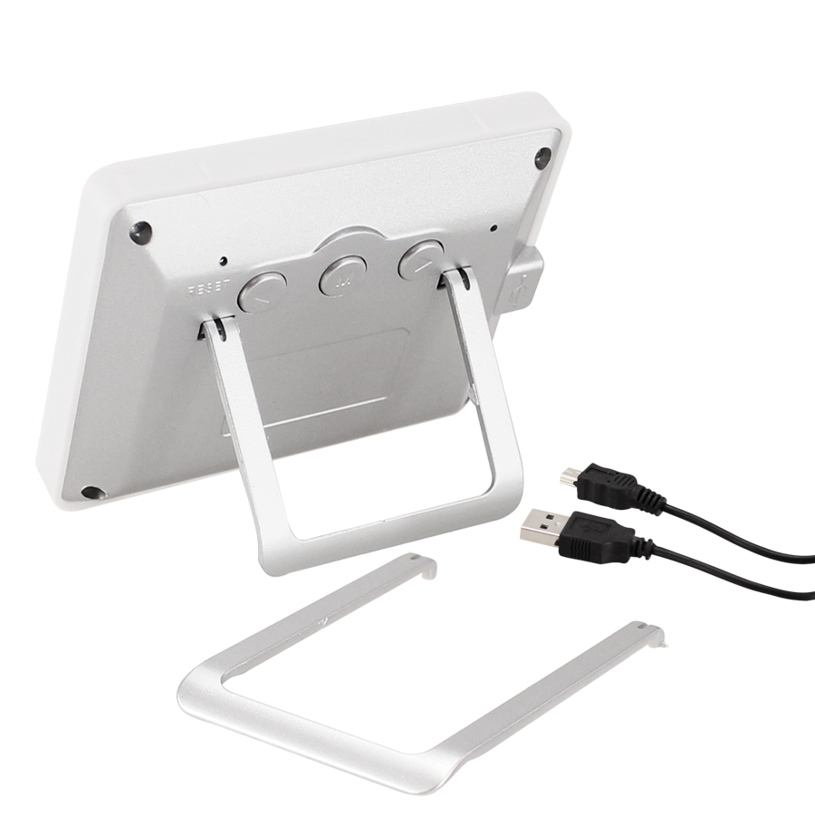 Estación Digital Porta-Fotos con marco metálico autosustentable, pantalla LCD 2.4″ desmontable. Multi-idioma con Reloj, Alarma y Calendario. Memoria interna de 8MB. Incluye batería de litio de 3.7V-180MAH y fuente USB/Mini-USB 5V.