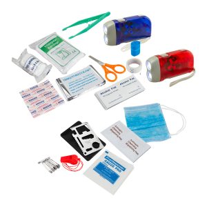 Kit de Primeros Auxilios en Estuche rígido de tela. Contiene 49 accesorios: 1 cabestrillo triangular, 1 linterna dínamo, 1 pito, 1 cinta adhesiva, 1 mascarilla, 4 toallitas húmedas antisépticas, 5 sobres con gaza estéril, 10 alfileres de gancho, 1 manta térmica plateada, 1 pinza, 1 multi-herramienta tarjeta metálica con funda, 1 banda PBT, 1 tijera, 10 toallitas húmedas con alcohol, 10 parche curitas.