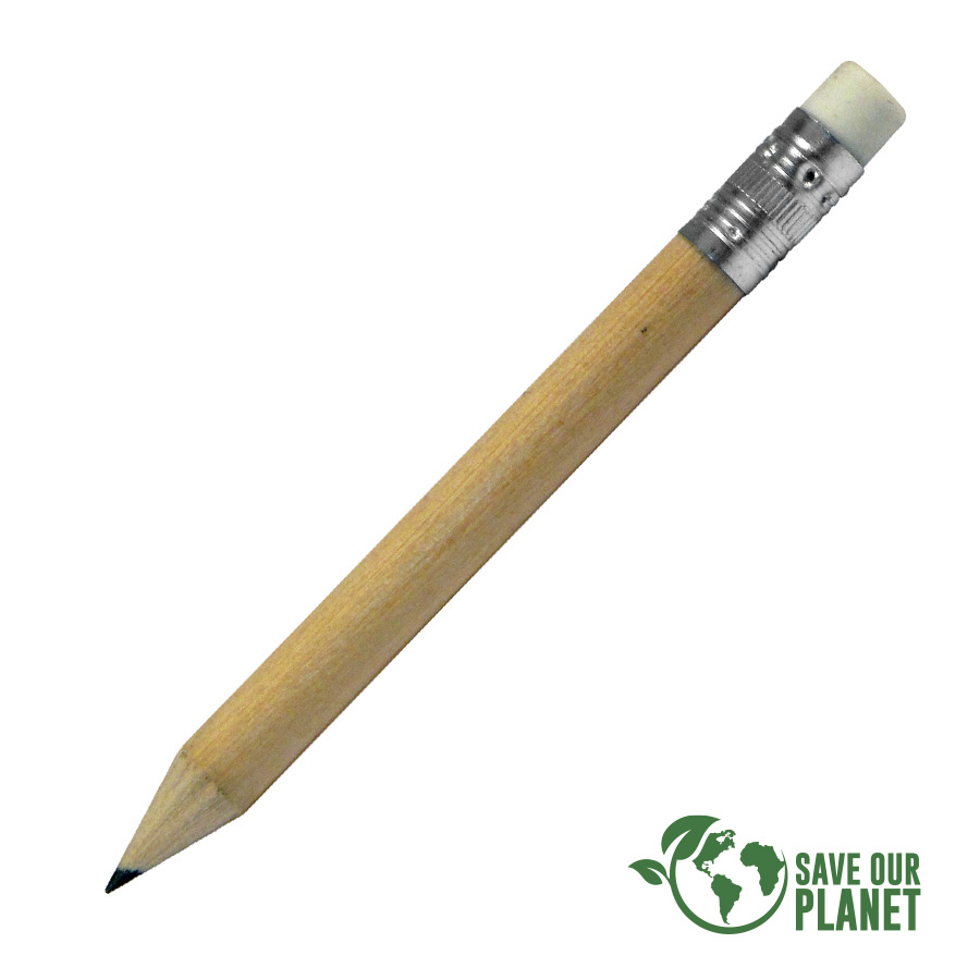 Lápiz grafito corto de madera barnizada. Cuerpo 100% cilíndrico, ideal para imprimir logos sin problemas. Incluye goma de borrar y viene con punta lista.