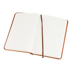 Libreta tamaño A6, con cubierta de cartón piedra forrada en PU simil cuero de 3mm de espesor. Interior 80 hojas lineadas amarillas de 80gsm. Incluye banda separador de hojas al tono. Presentación individual en bolsa de polipropileno.
