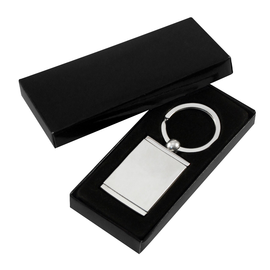 Llavero Metálico Porta-Foto. Presentación en estuche laminado negro con cuna aterciopelada.