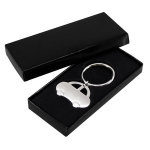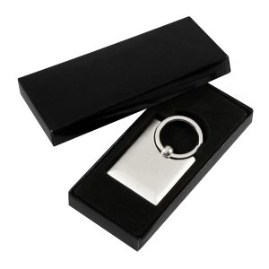 Llavero Metálico «Strap» con huincha de polyester de color. Presentación en estuche laminado negro con cuna aterciopelada.