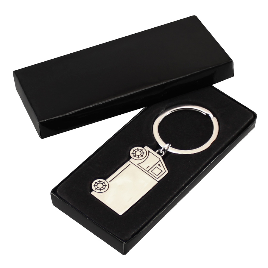 Llavero Metálico modelo «Truck», con forma de camión. Presentación en estuche laminado negro con cuna aterciopelada.