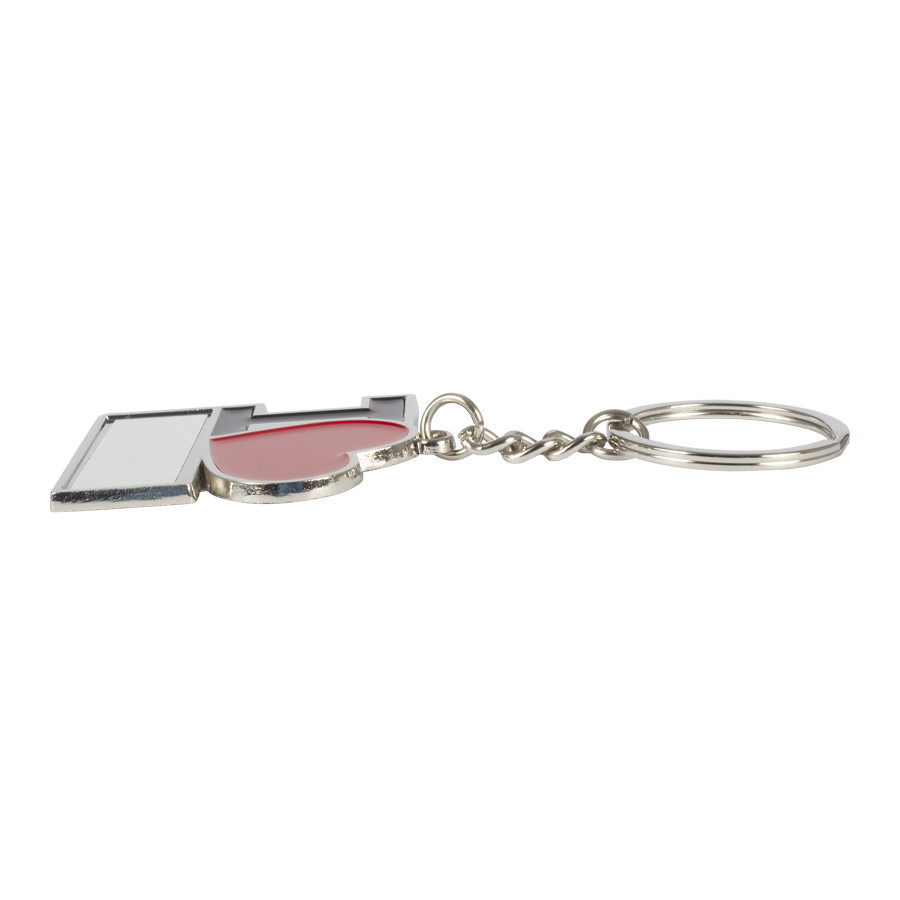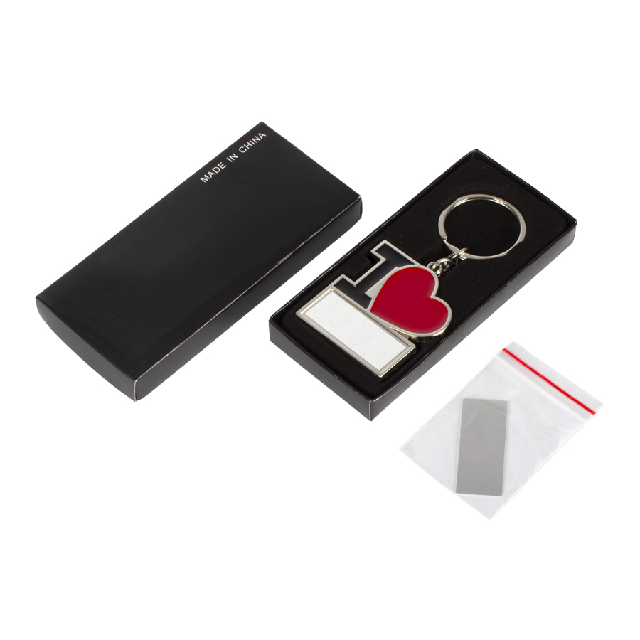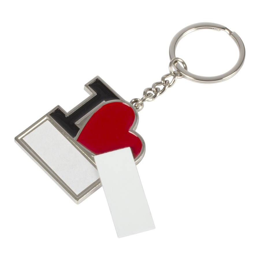 Llavero metálico «I♥», para Sublimación. Incluye argolla llavero de Acero inoxidable. Presentación en estuche negro con cama aterciopelada negra.