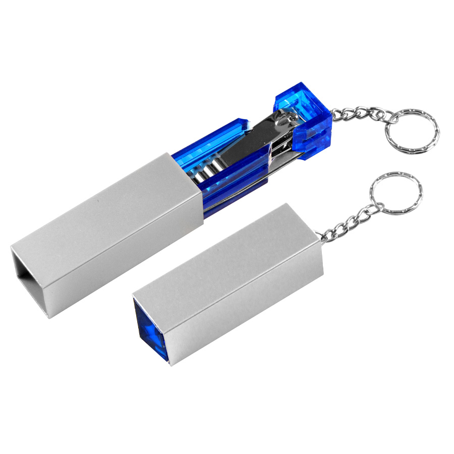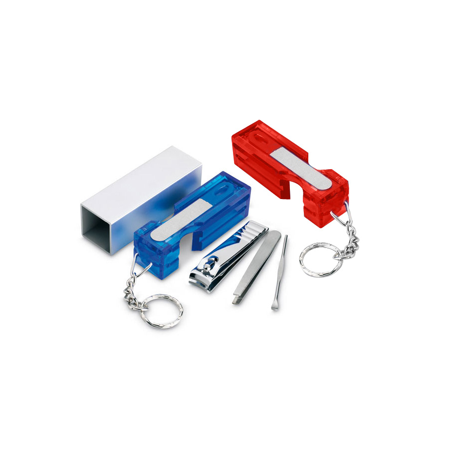 Set de Manicure con Llavero, en tubito rectangular plateado.