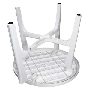 Mesa Plástica redonda modelo «Roma» de Polipropileno. Cuenta con base de 4 patas desarmables adosadas (unidas entre sí), lo que le da una resistancia y estabilidad superior a los modelos nacionales, con topes anti-deslizantes en las 4 patas. Ideal para terrazas, jardines, playa o eventos. Puede usarse tanto en interiores como en exterior. Es muy liviana, pesa sólo 5.6 kgs. y como es desarmable, ocupa poco espacio y es muy fácil de trasladar y guardar en grandes cantidades. Fácil de lavar. Producto importado de calidad superior.