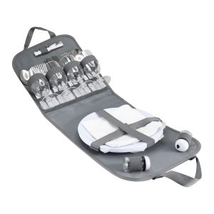 • Accesorios: 4 cuchillos + 4 tenedores + 4 cucharas de acero inoxidable, salero y pimentero plásticos, 4 servilletas de algodón, 4 copas plásticas transparentes, 4 platos plásticos de PS blanco, 1 multiherramienta para el vino.