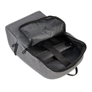 Mochila Porta-Notebook modelo «NEPTUNE». Fabricada en tela poliéster 600D/PU bitono. Capacidad 20 litros, tamaño 31 x 46 x 14 cm. Incluye múltiples compartimento interior reforzado y acolchado para Laptop, espalda acolchada con red de ventilación + bolsillo delantero y 2 bolsillos laterales.