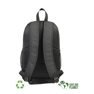 Mochila Porta-Notebook modelo «RPET». Fabricada en material reciclado RPET y poliéster 250D/PVC. Capacidad 20 litros, tamaño 29 x 48 x 14.5 cm. Incluye compartimento interior reforzado y acolchado para Laptop, bolsillo delantero y 2 bolsillos laterales con malla.