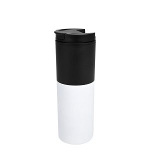 Mug térmico metálico bicolor blanco/negro con doble pared aislante, modelo «HIGHWAY», interior plástico PP negro, exterior bicolor de Acero inoxidable 201 SS. Producto BPA FREE, para el contacto con líquidos y alimentos. Tapa rosca de plástico PP con sello cilíndrico de silicona y sistema de cierre/apertura antiderrame. Fondo de silicona negra ABS anti-deslizante. Capacidad 450ml. Presentación en bolsa plástica OPP + caja de regalo de cartón laminado negro.