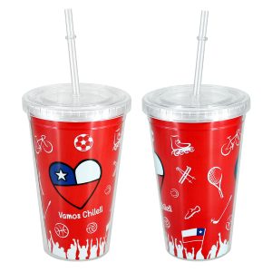 Mug vaso plástico transparente con gráfica interior «Vamos Chile». Incluye tapa rosca y bombilla.