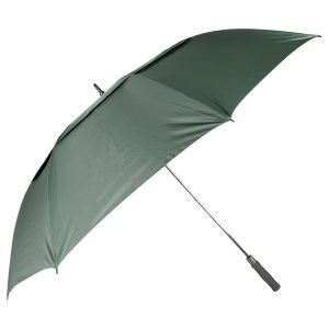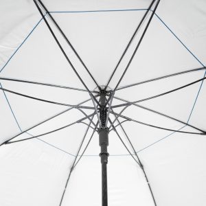 Paraguas gigante de Golf, con 8 cascos de tela 190T PONGEE, reverso UV. Incluye doble casco WINDPROOF (grande y pequeño), que evita el volcamiento ya que permite que el viento pase entre los cascos. Contiene varas reforzadas Anti-Vuelco de Fibra de Vidrio color negro y sistema de apertura automático. Mango recto de EVA negro. Incluye funda al tono de 190T PONGEE.