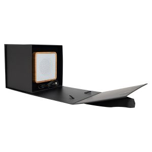 10. Embalaje: Caja de regalo en cartón lacado negro, con asas de poliéster. 11. Funciones: on/off, skip forward /louder, Play/Pause, Skip back/quieter 12. Lector de tarjeta de memoria SD card 13. Interface con cable negro USB/tipo-C 14. Rejilla metálica superior lacada color blanco