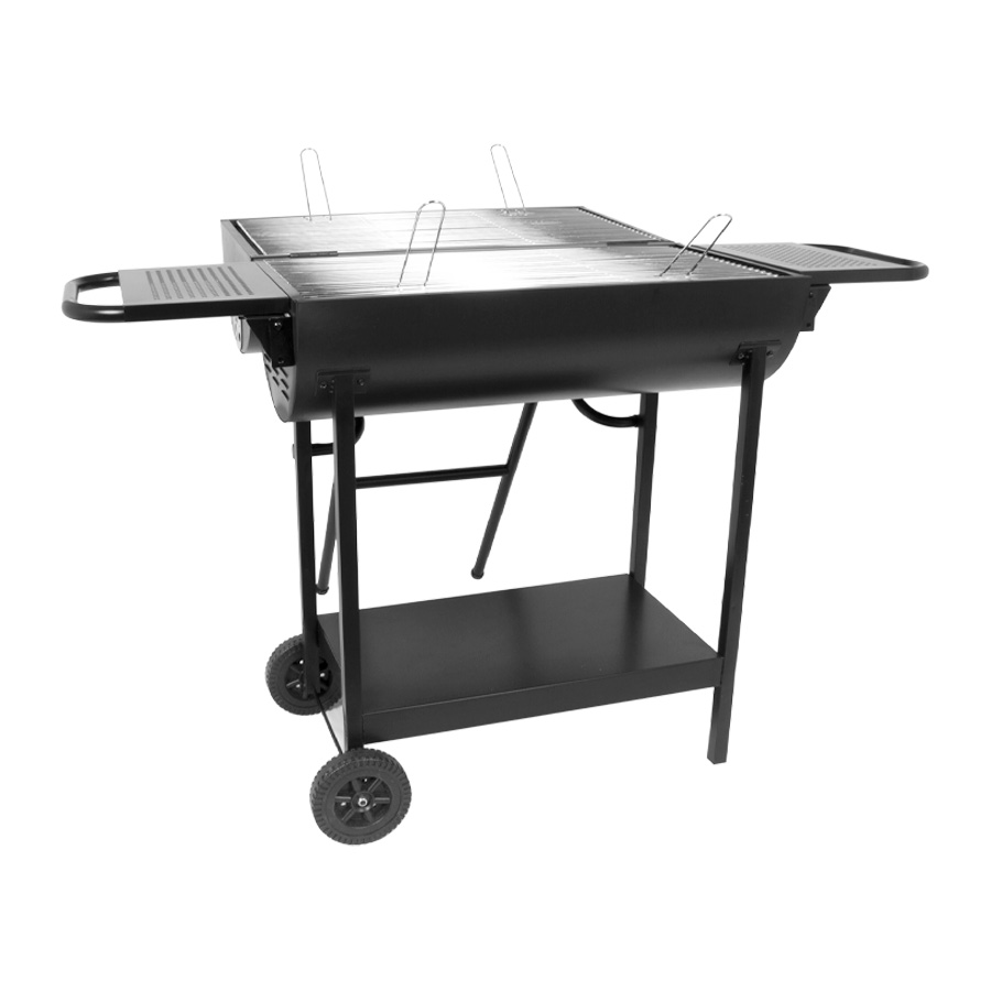 Parrilla doble a Carbón de Acero negro, modelo «Andes». Altura para cocinar: 80cm. Rejillas cromadas para cocinar: 2 unidades x 69.5 x 37cm x 4mm. Tapa: 74.5 x 40 x 20cm. Bowl para fuego: 74.5 x 40 x 20cm. Bandejas laterales: 2 unidades x 34 x 27.8cm. Incluye Manual instructivo de armado en español.