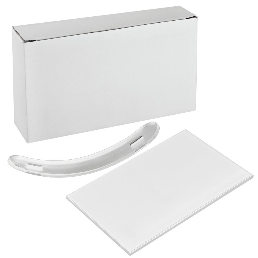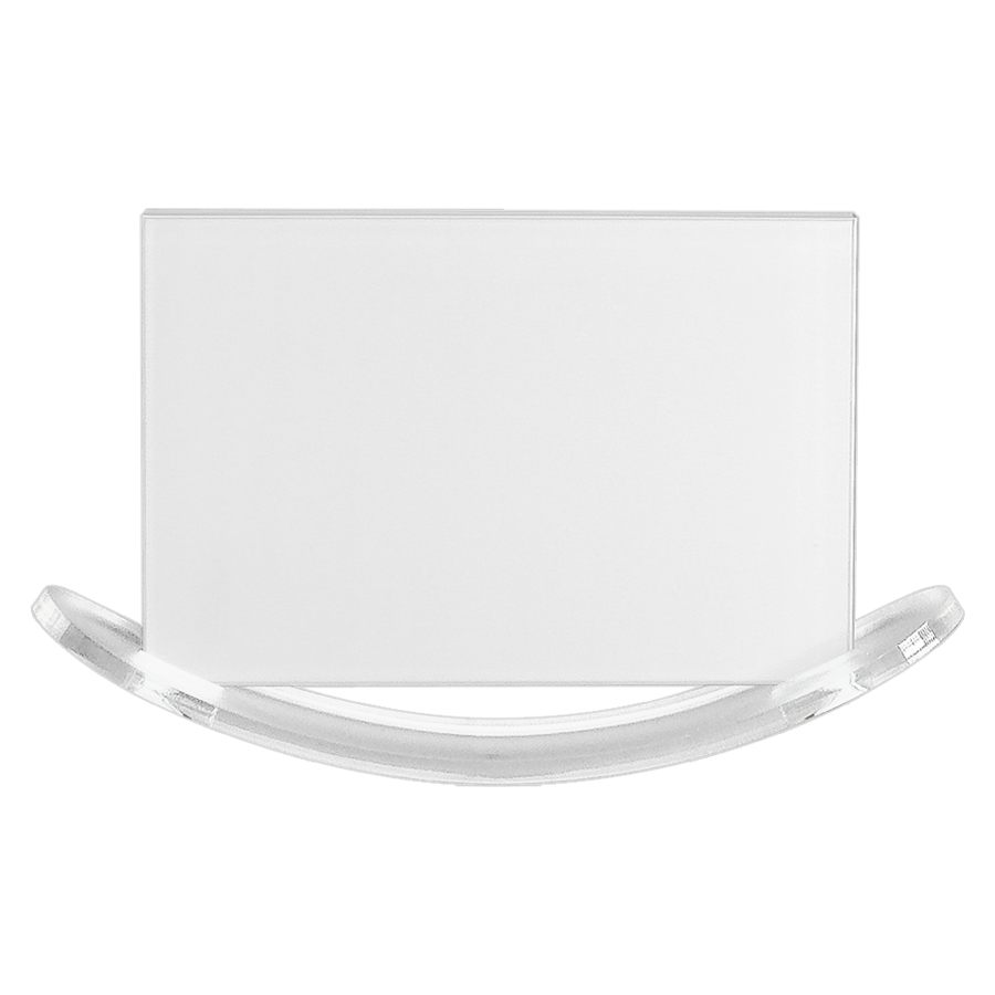Porta-Retrato balancín para Sublimación. Base curva Acrílico frozen. Porta-Foto de Vidrio de 15.3 x 10.2 x 0.3 cm. Presentación en caja de Cartón blanco.