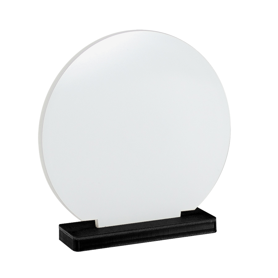 Porta-Retrato redondo para Sublimación. Base plástico negro. Porta-Foto de Acrílico frozen de 13 x 12.5 x 0.4 cm. Presentación en Bolsa plástica.