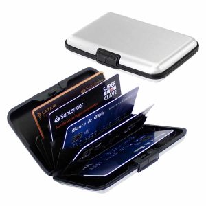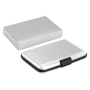 Estuche rígido Porta-Tarjetas (tamaño Tarjeta de Crédito) con protección anti-clonación o Escaneo RFID. Capacidad interior para 6 Tarjetas. Presentación en bolsa de polipropileno y Estuche plateado de Regalo.