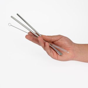 Set de 2 bombillas de acero inoxidable de 21.5cm. de largo c/u + cepillo para limpiar de 22cm de largo , presentados en bolsa de Lino tipo saco color natural de 23.5 x 4 cm. Cuenta con asa-cordón retraíble de Algodón, en la parte superior de la bolsa.