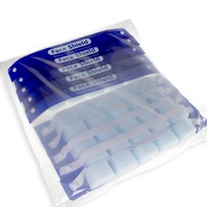 Set (Bolsa) de 10 Face Shield – Escudo Protector Facial de mica plástica transparente para la protección de transmisión de partículas por vía aérea. Incluye esponja para la frente y banda elástica. Fácil y cómoda de usar.