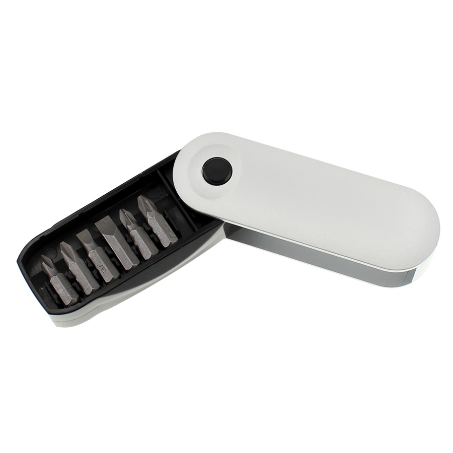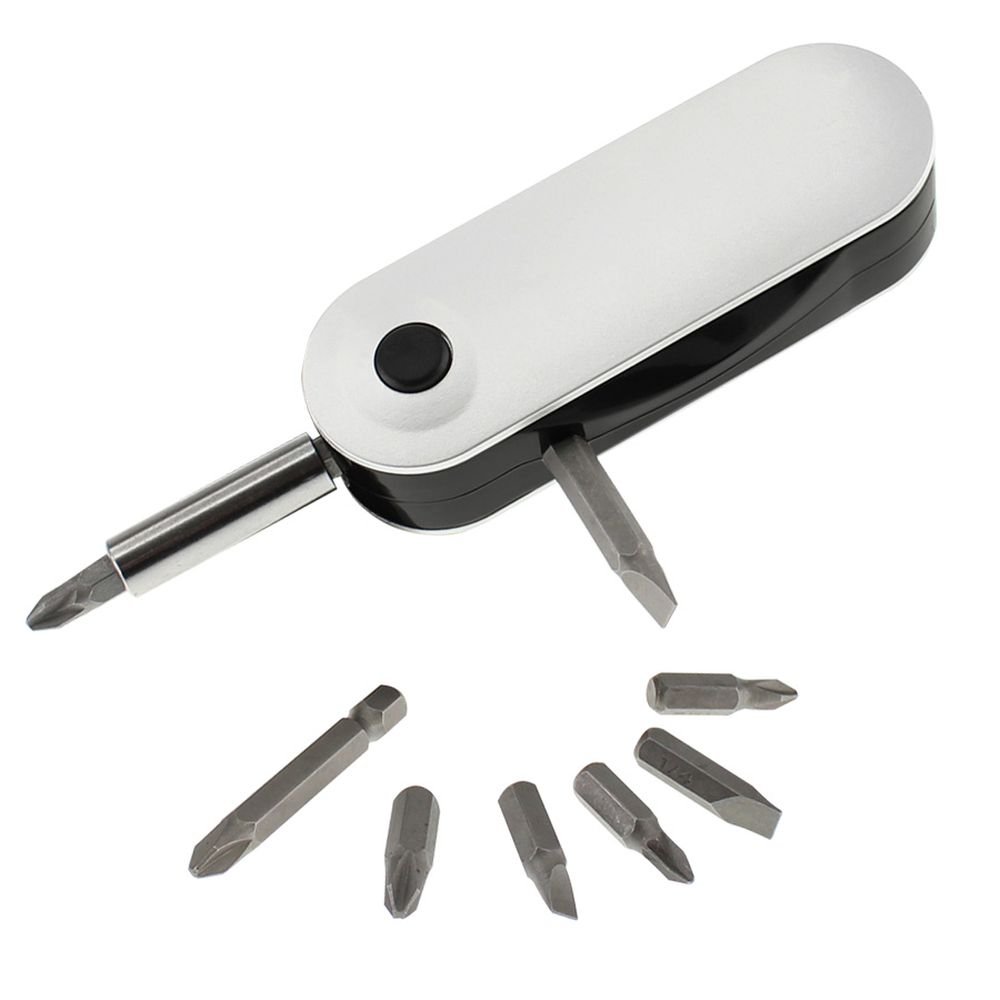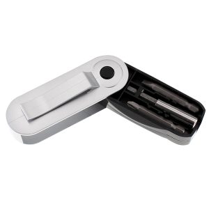 Set de 8 Destornilladores Metálicos en Estuche plateado con clip de sujeción.