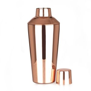 Fino regalo set de cóctel 5-en-1 de Acero inoxidale 304 SS, en acabado color cobre, incluye: coctelera 700ml con tapa 22cm, vaso dosificador doble (jugger) 8.3cm, tenazas para hielo 16cm, cuchara-tenedor revolvedor 23cm, colador/batidor 19cm. Producto BPA FREE, para el contacto con líquidos y alimentos. Capacidad coctelera 700ml. Presentación en caja de regalo de cartón laminado negro.