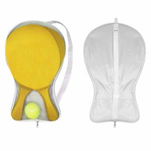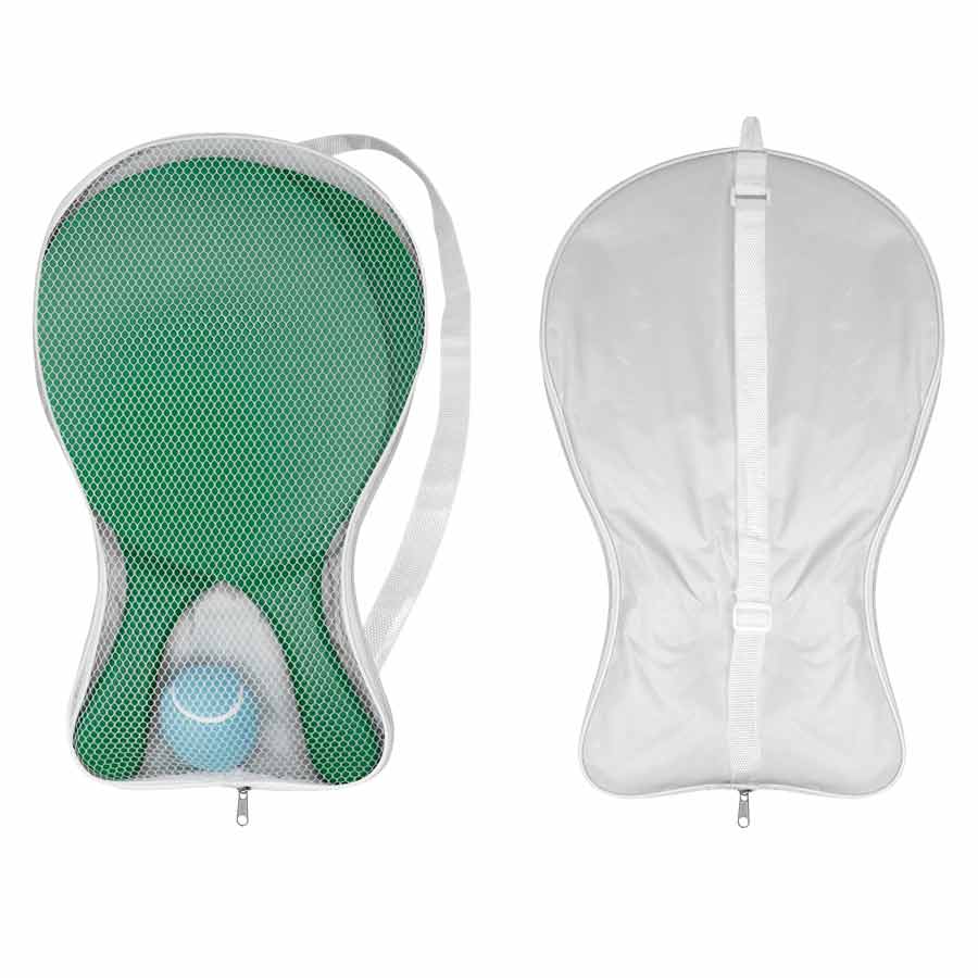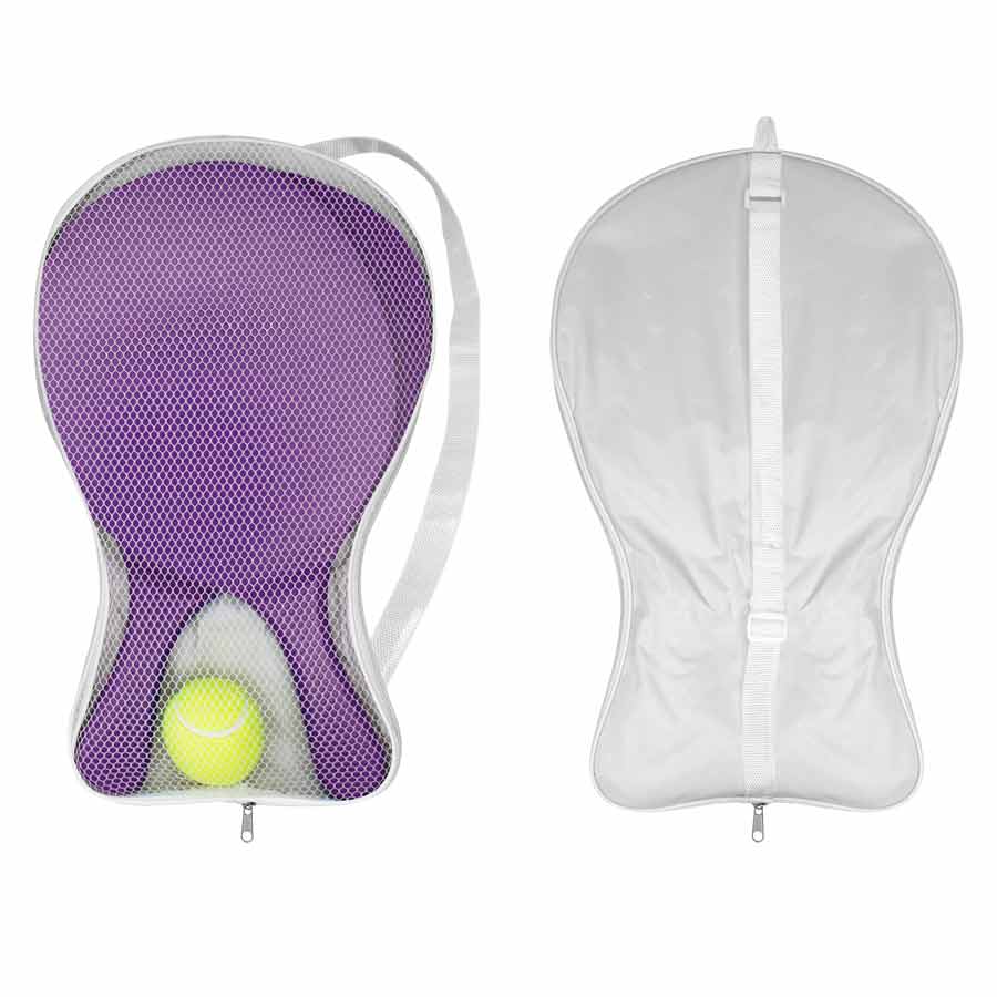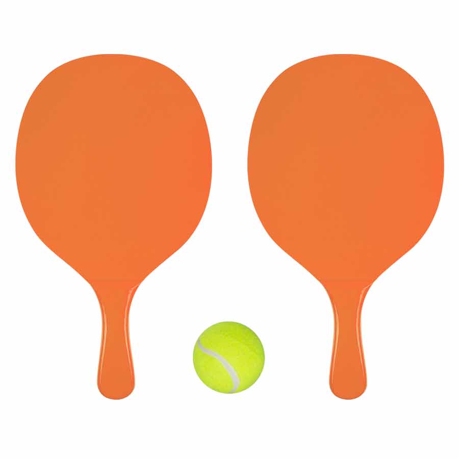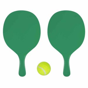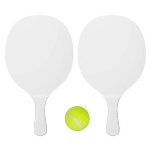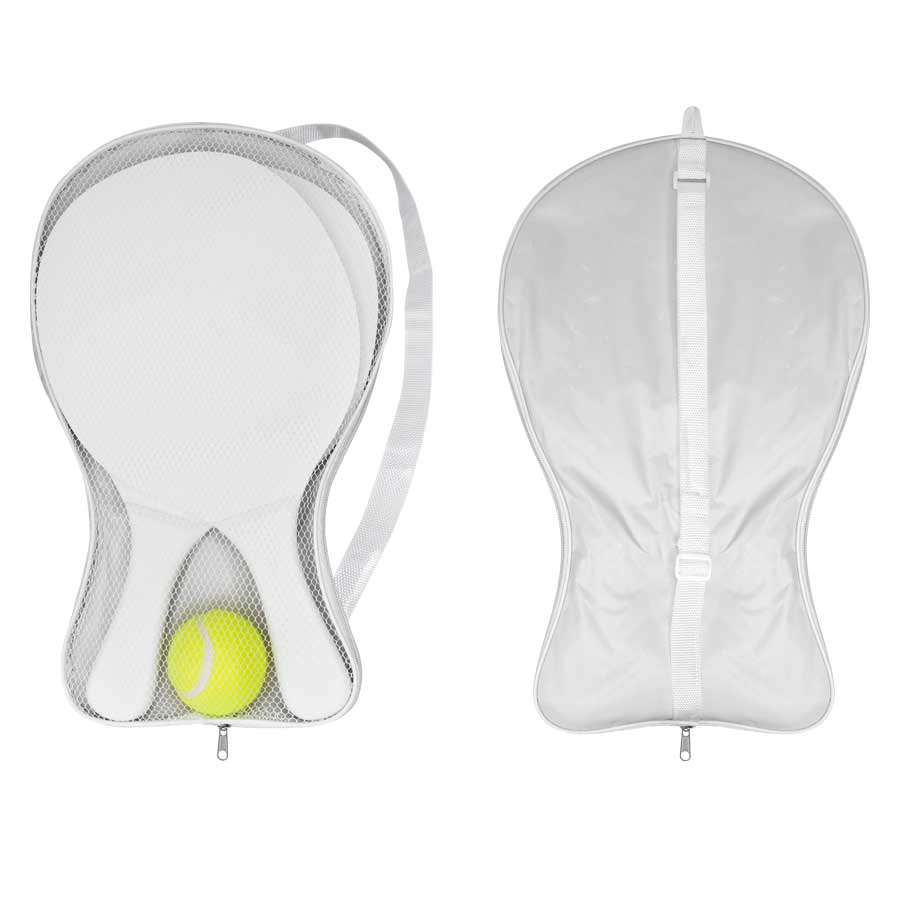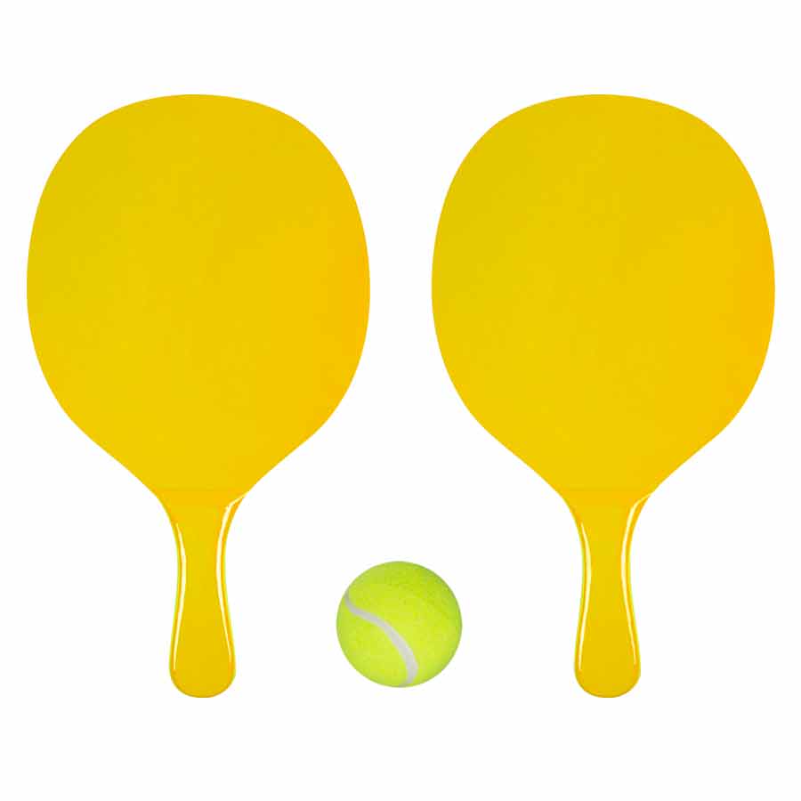 Set de Paletas de Playa de MDF esmaltado de 12mm. de espesor, modelo «Premium». Incluye bolso de tela poliéster blanco con frente malla y cinta para colgar + pelota de tenis amarilla. Cada paleta viene dentro de bolsa de polietileno.